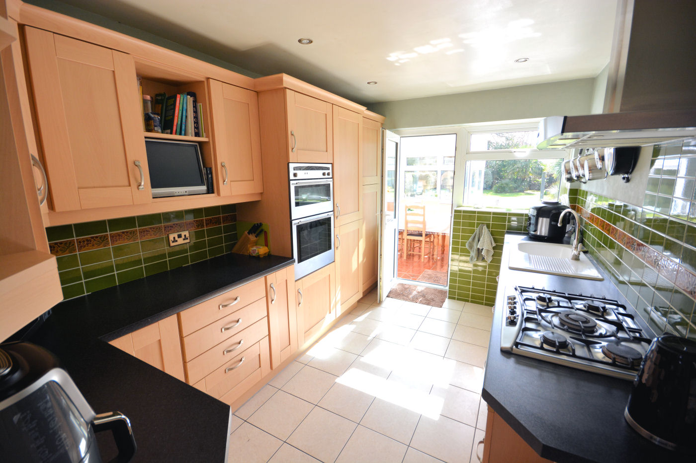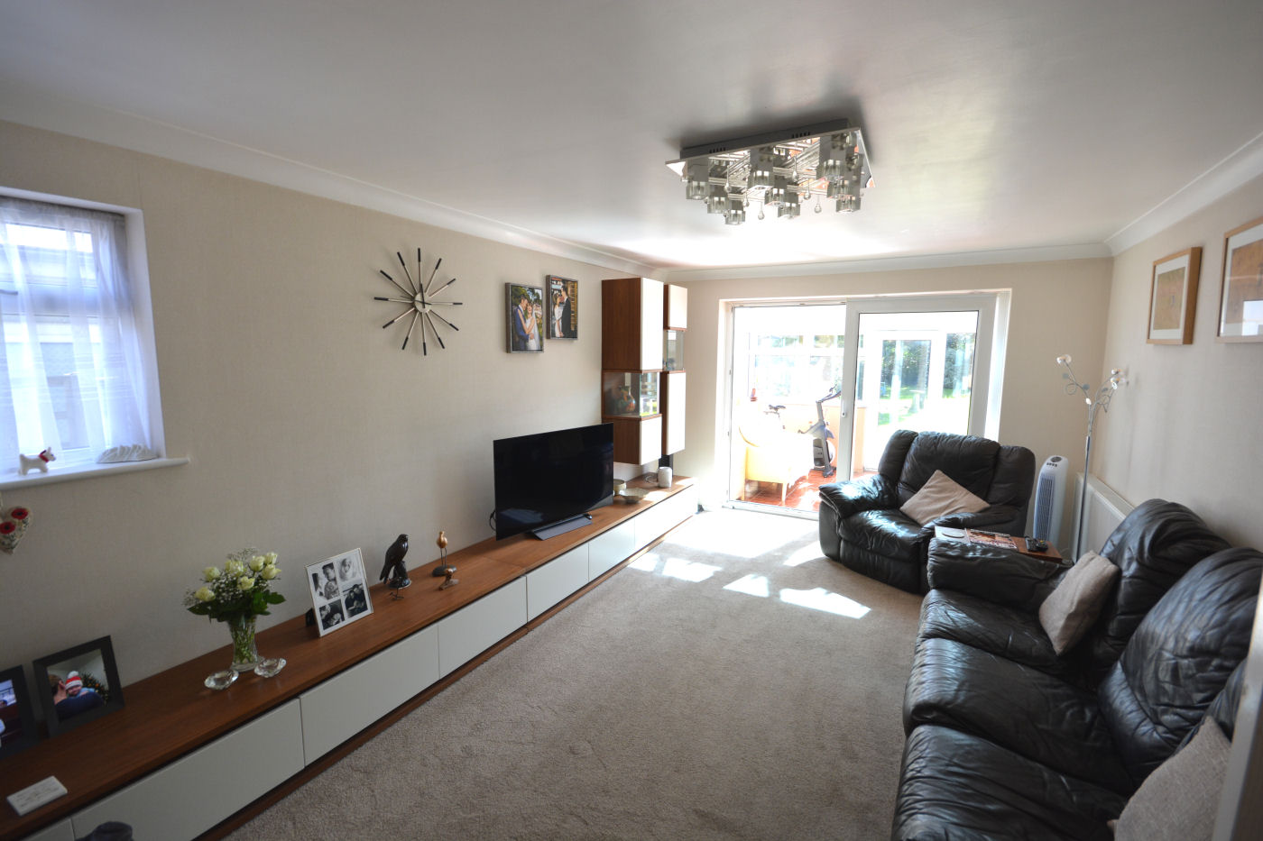 Front door leads to the entrance hallway with built in storage cupboard and access to loft space. The kitchen has a range of wall mounted and base storage cupboards and drawers, single bowl single drainer sink unit with mixer tap, five ring burner gas hob with extractor fan above, integrated double oven, integrated fridge/freezer, part tiled walls, inset spot lighting, door to the conservatory which has triple aspect windows, tiled floor and door to the rear garden. The spacious lounge has window to the side aspect and sliding door to the conservatory.