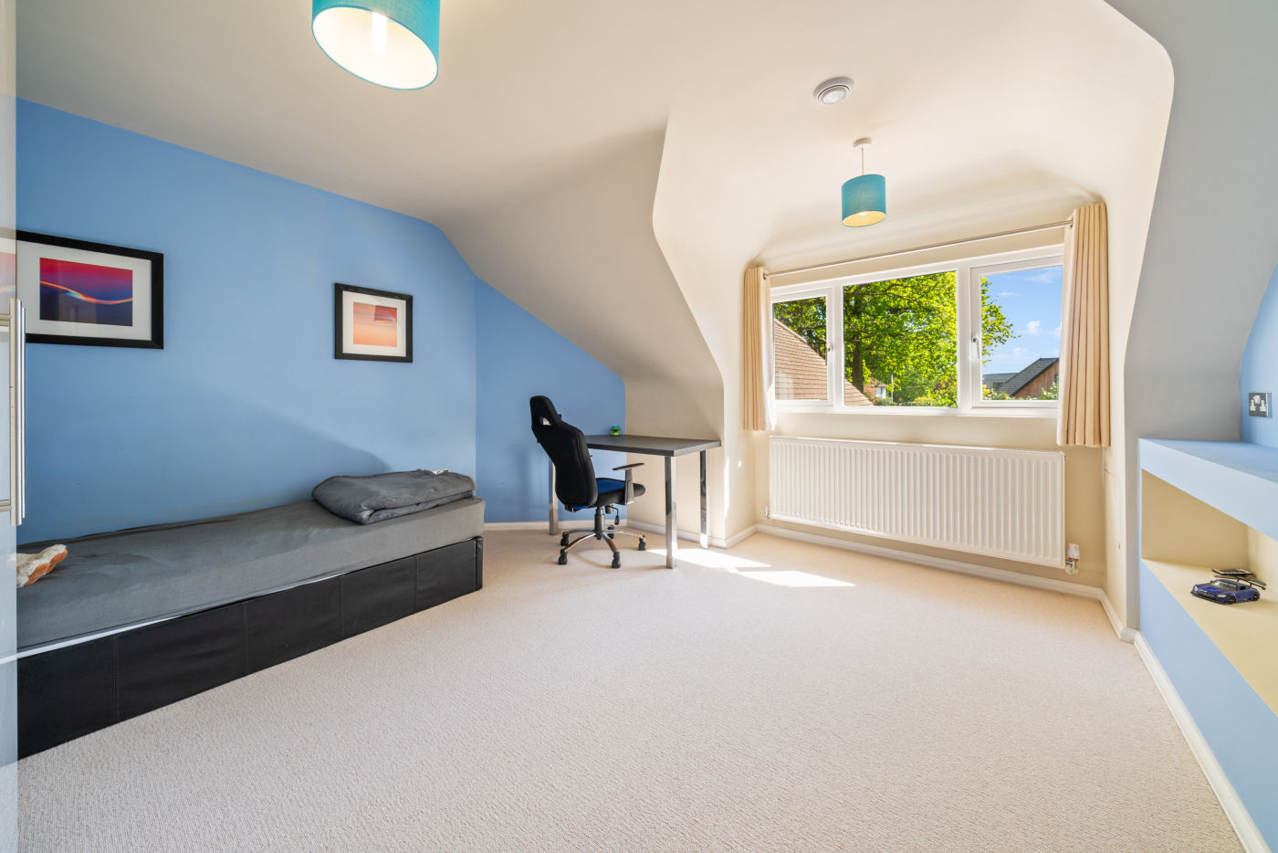 Upstairs, the spacious landing provides access to four further double bedrooms. The principal suite boasts a luxurious ensuite shower room and a walk-in wardrobe. There is also a separate shower room with toilet, and a well-sized study-ideal for working from home.
