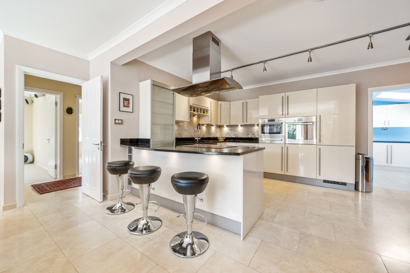 At the heart of the home is the sleek German Nolte kitchen, featuring South African granite worktops and upstands, alongside premium appliances including a Bosch oven, combi Quantum oven, warming drawer, induction hob with extractor, integrated dishwasher, and fridge/freezer.