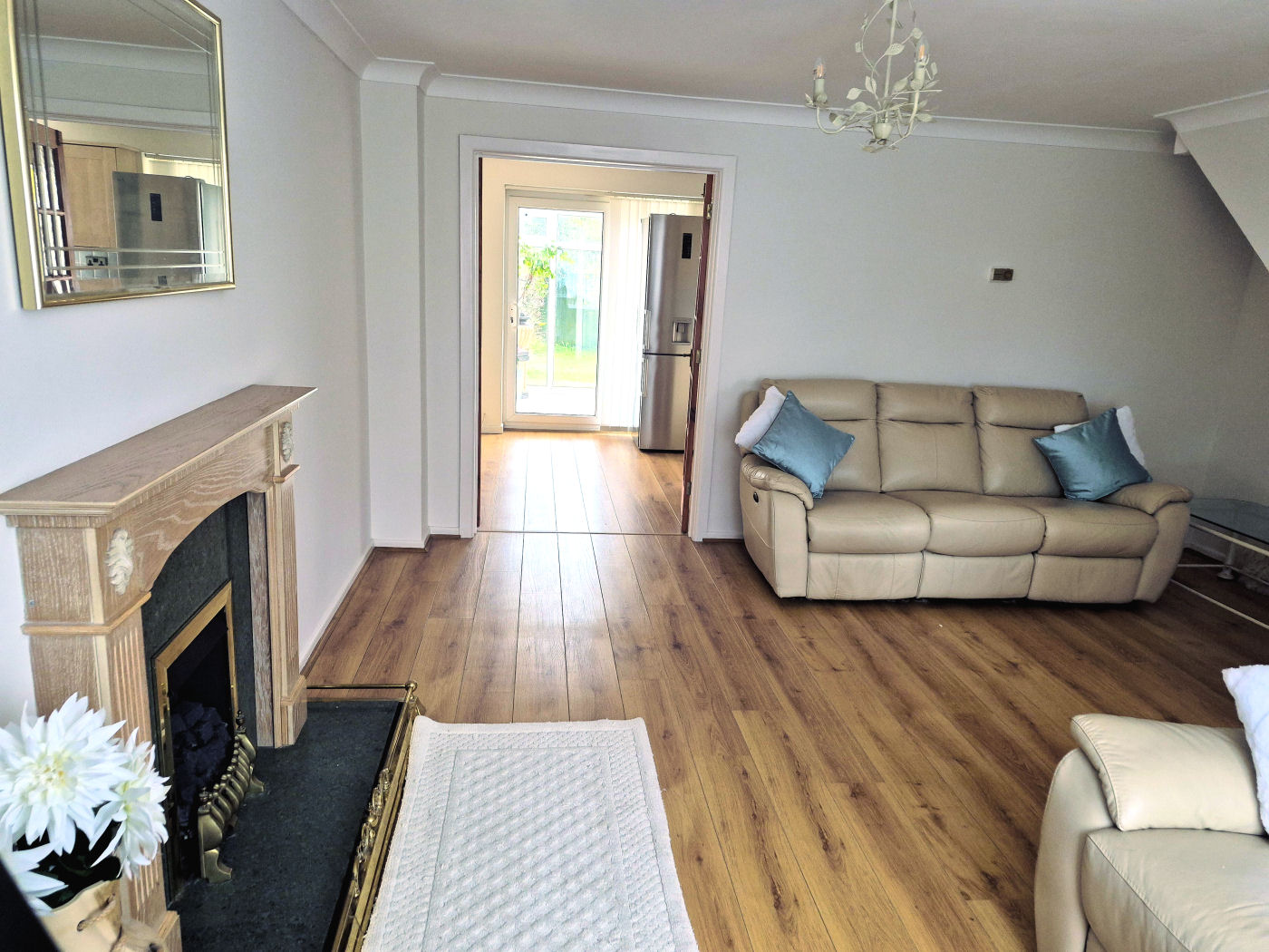 A double glazed front door with frosted side screen gives access into the entrance hall which has wood effect flooring, telephone point, stairs rising to the first floor and window to side aspect. The light and airy sitting room has window to front aspect, wood effect flooring, television point and a central fireplace with inset gas fire, marble effect surround and wooden mantle. The modern fitted kitchen/diner has frosted door to side, window to rear aspect, wood effect flooring, range of wall and floor mounted cupboards, roll top working surfaces, part tiled walls, one and a quarter single sink with drained and mixer tap, space for tall fridge/freezer and washing machine and integrated appliances to include fridge, dishwasher, oven, four ring ceramic hob and extractor fan over. Off the kitchen/diner sliding doors lead into the conservatory which has wood effect flooring and access to the rear garden.