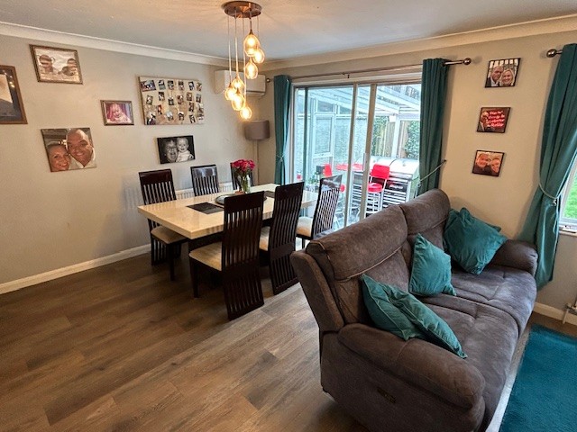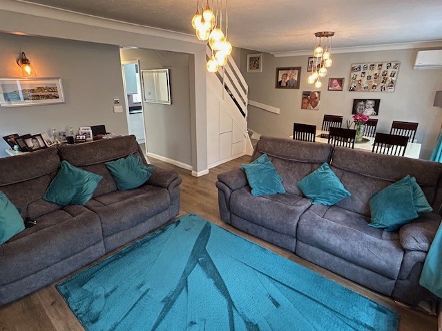 The double glazed frosted front door gives access into the entrance hall which has Karndean wood effect flooring, telephone point and access into the cloakroom/utility which has Karndean wood effect flooring, three useful storage cupboards, one of which provides space and plumbing for washing machine and tumble dryer, further cupboard housing the wall mounted boiler, vanity unit with inset wash hand basin and mixer tap and low level flush WC. The kitchen has window to front aspect, range of wall and floor mounted cupboards, work surfaces over, single sink with mixer tap, Karndean wood effect flooring, nest of three pan drawers and integrated appliances to include fridge/freezer, dishwasher, oven, grill, microwave, four burner induction hob and extractor fan over. The spacious lounge/dining room has Karndean wood effect flooring, door to side, window and sliding doors to rear, TV point, understairs storage cupboards, air conditioning unit and stairs rising to first floor. To complete the accommodation on the ground floor is the conservatory which has tiled flooring and access to the rear garden.
