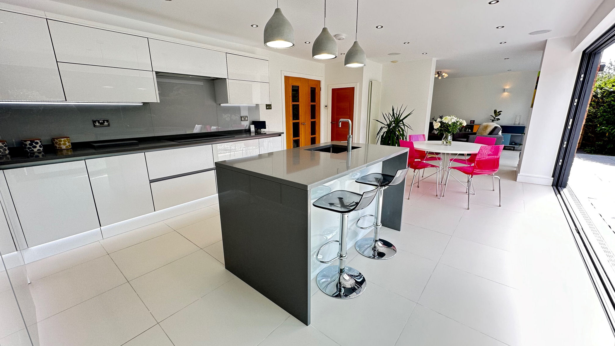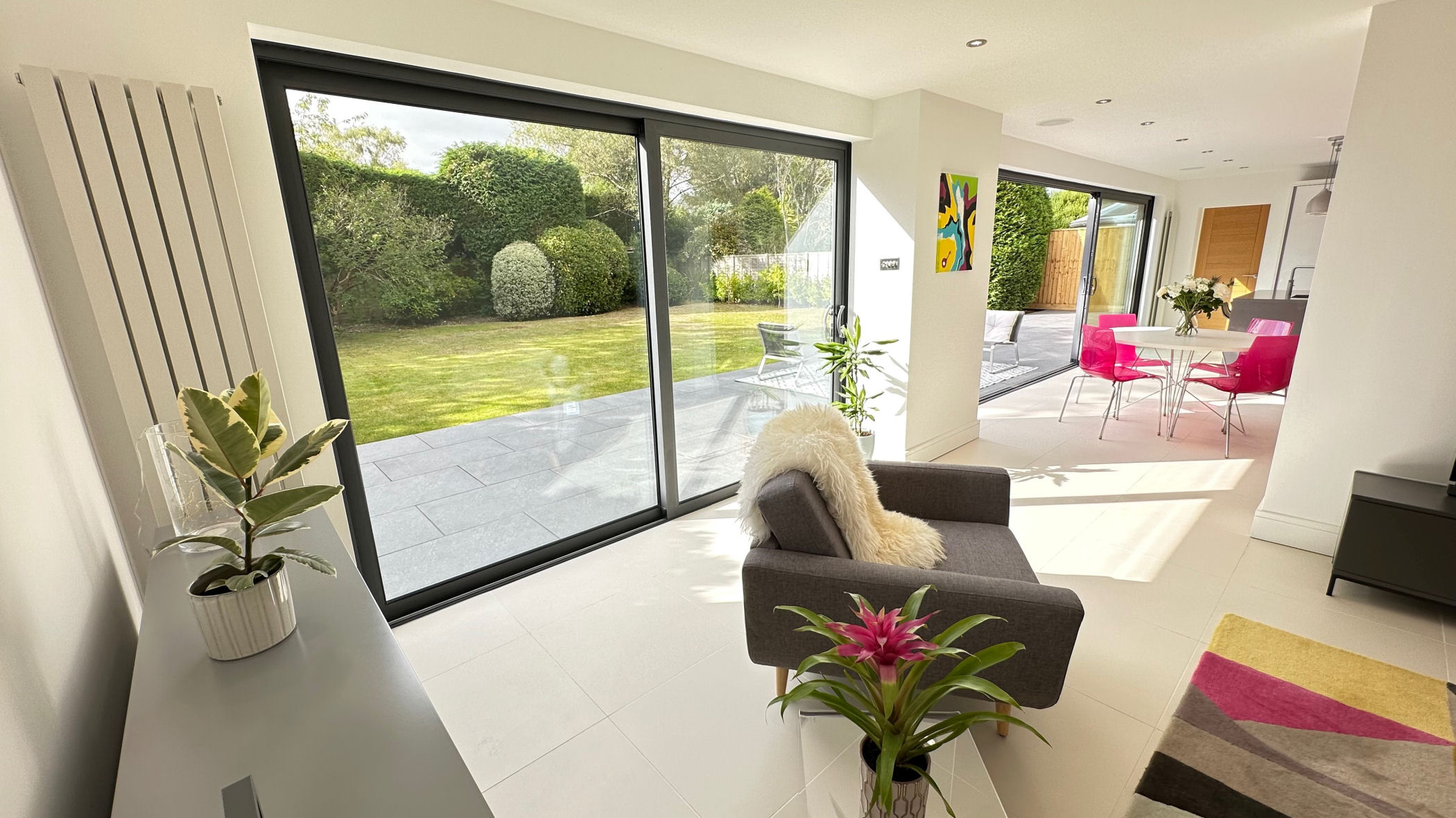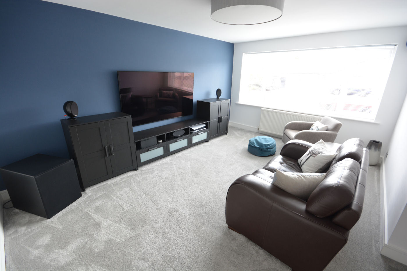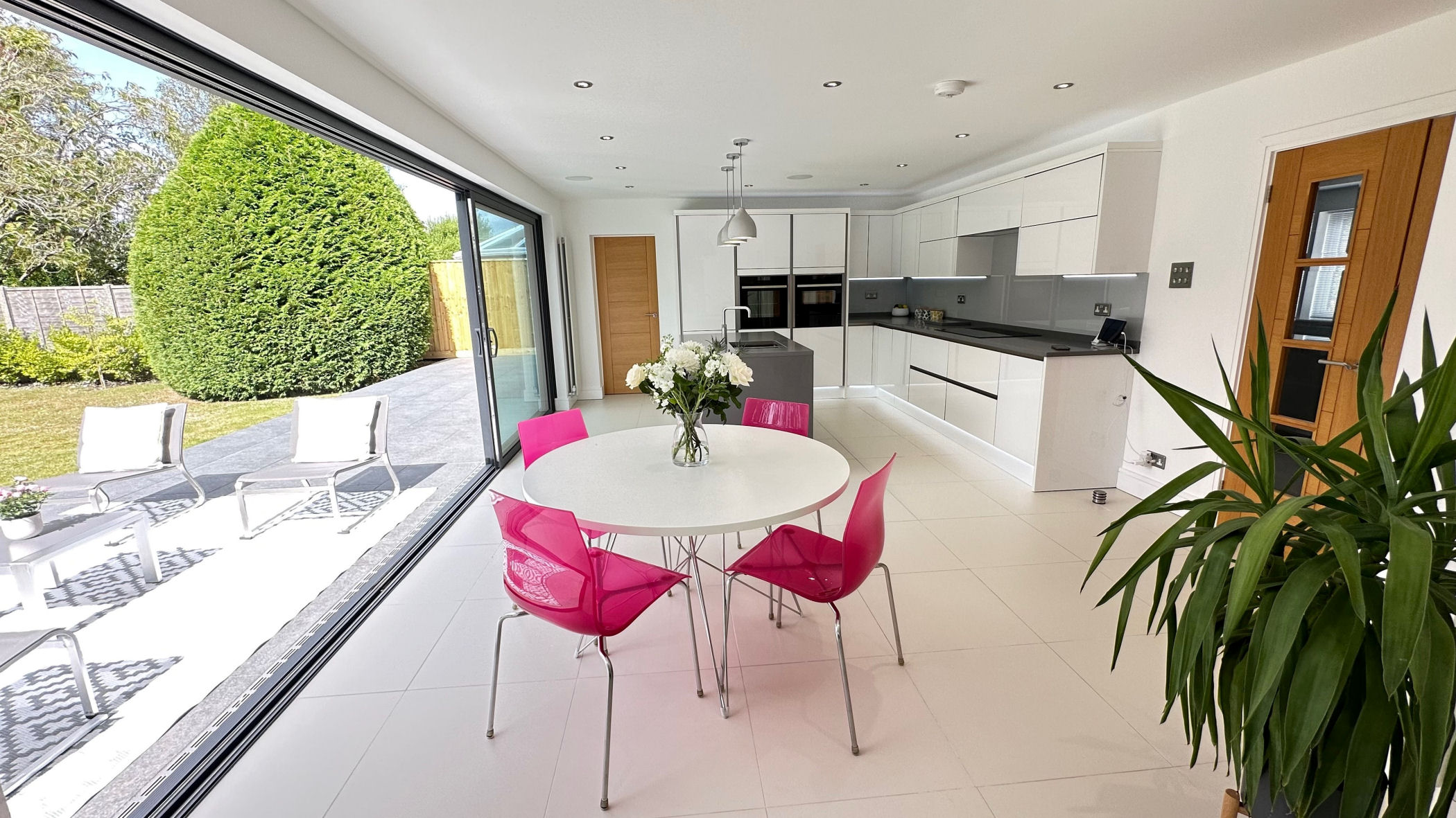 Open to the kitchen/diner, the family room extends the open-plan feel with ceiling-mounted Sonos speakers, creating an immersive audio environment ideal for family gatherings and entertainment.