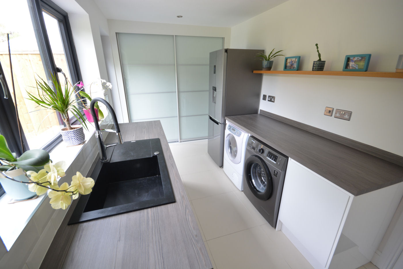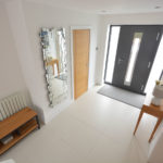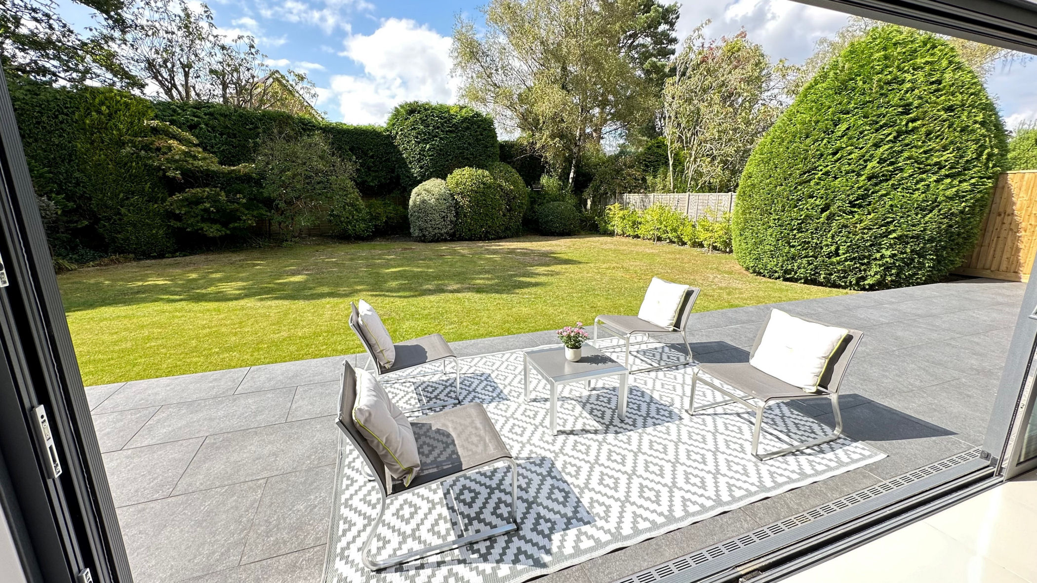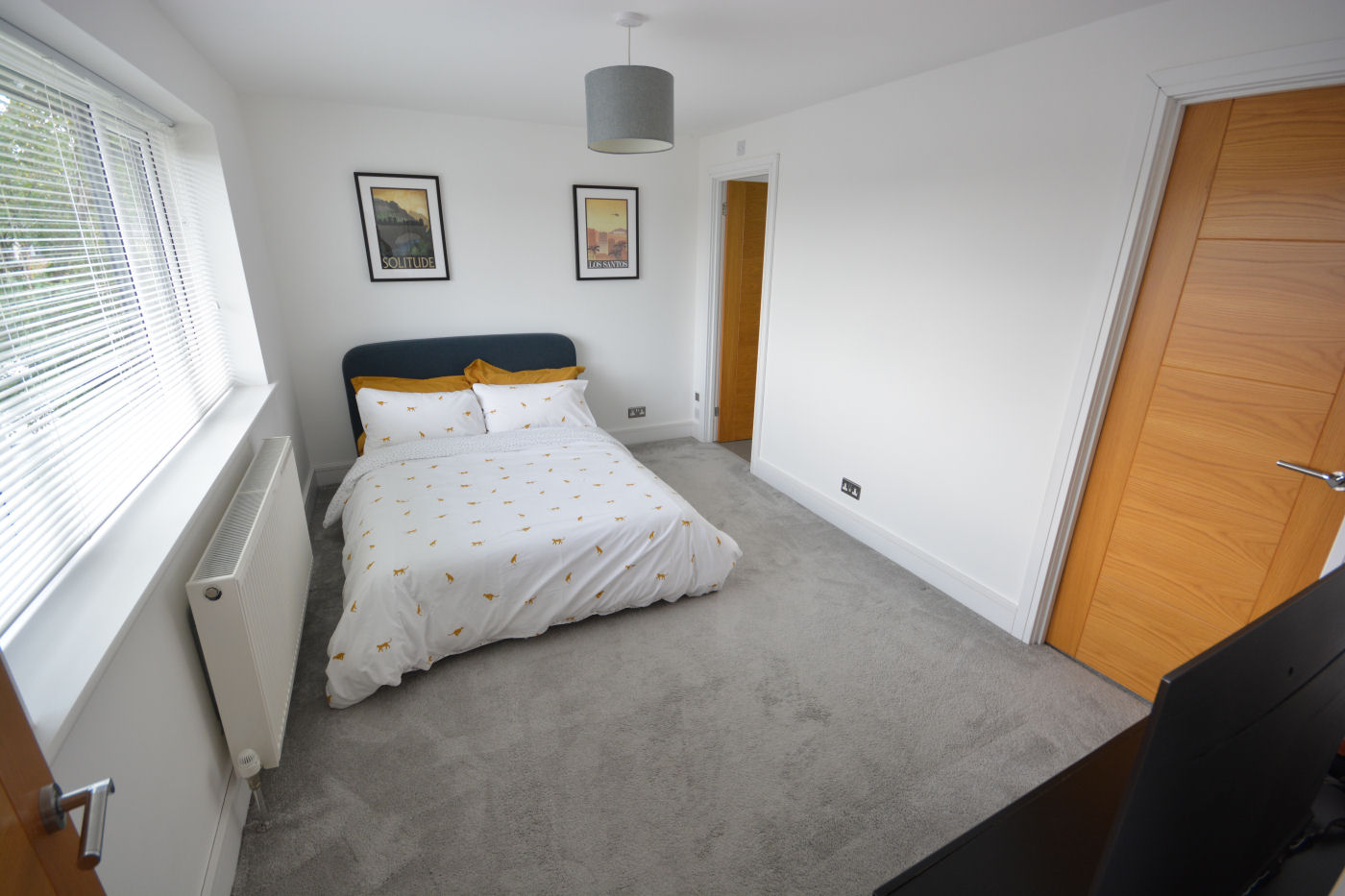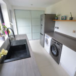 The heart of the home is the kitchen/dining room, equipped with modern conveniences and high-end finishes. The kitchen features wall-mounted and base storage units, an integrated Neff five-ring induction hob with extractor fan above, an integrated Neff oven and combination microwave (with a 2-year guarantee), and an integrated fridge/freezer. The island unit with Quartz worktops includes an inset sink with a Quooker instant hot water tap. Underfloor heating runs throughout the kitchen/diner, enhancing the sense of comfort and luxury. A standout feature of this space is the impressive 6-metre sliding doors, seamlessly blending indoor and outdoor living by opening onto a level patio. This design allows for effortless transitions between the kitchen and outdoor entertaining areas, perfect for modern living.