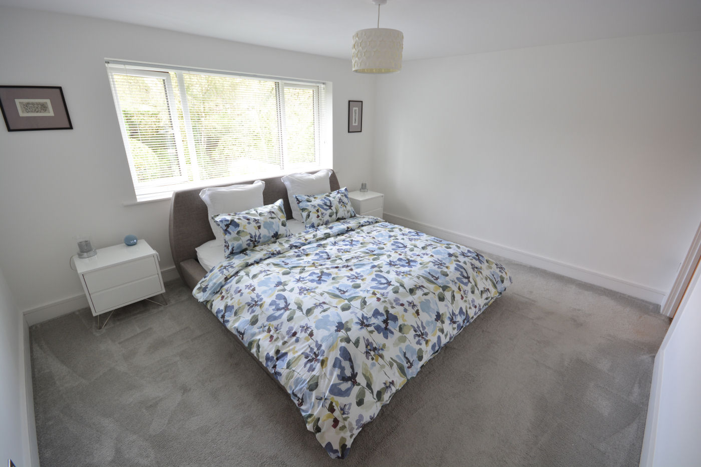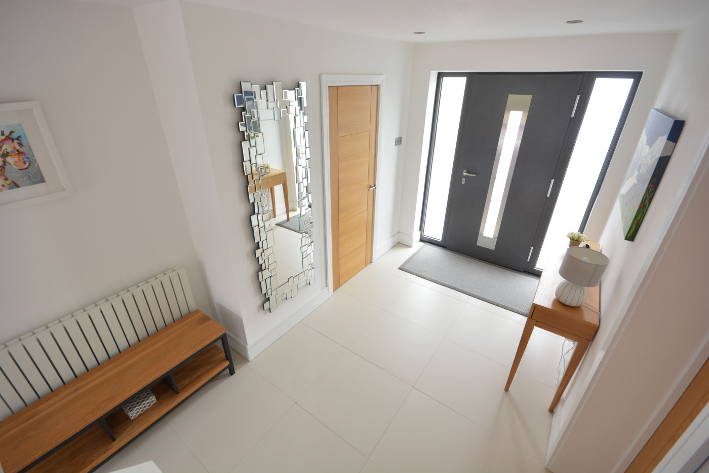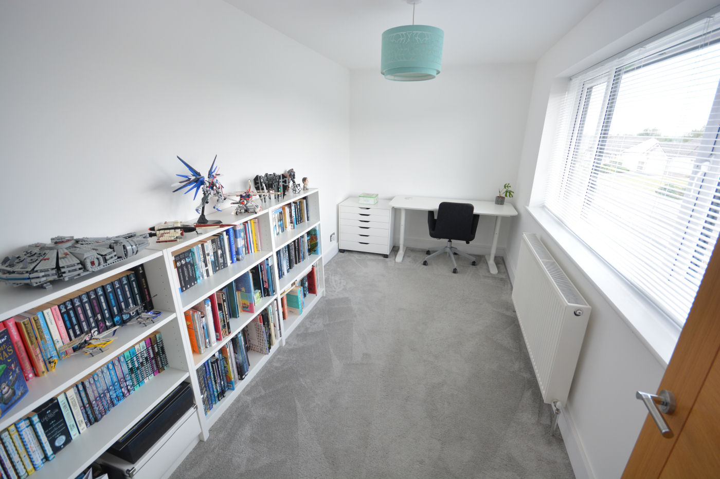 Ascending the stairs from the entrance hallway, the first-floor landing is well-lit with LED lighting and provides loft access. The master bedroom features a walk-in wardrobe with built-in furniture and an en suite shower room with a digital one-touch shower, offering ease and luxury. This room includes a wash hand basin with mixer tap set within a vanity unit, close-coupled WC, wall-mounted heated towel rail, and underfloor heating. The second bedroom, facing the front, also boasts a walk-in wardrobe and underfloor heating, along with an en suite shower room equipped with a similar digital one-touch shower and amenities. The third bedroom, overlooking the rear, has built-in cupboards, with one housing the central hub for the home’s technology, including the Cat 6 Ethernet, Sonos sound system, and home security system. The entire house is wired with Cat 6 network points in most rooms, providing fast, reliable internet connectivity throughout, ideal for home offices and streaming. The fourth bedroom offers ample space and flexibility. The family bathroom is well-appointed with a close-coupled WC, wash hand basin with mixer tap and vanity unit, panel-enclosed bath with dual showers, wall-mounted heated towel rail, part-tiled walls, and tiled flooring.