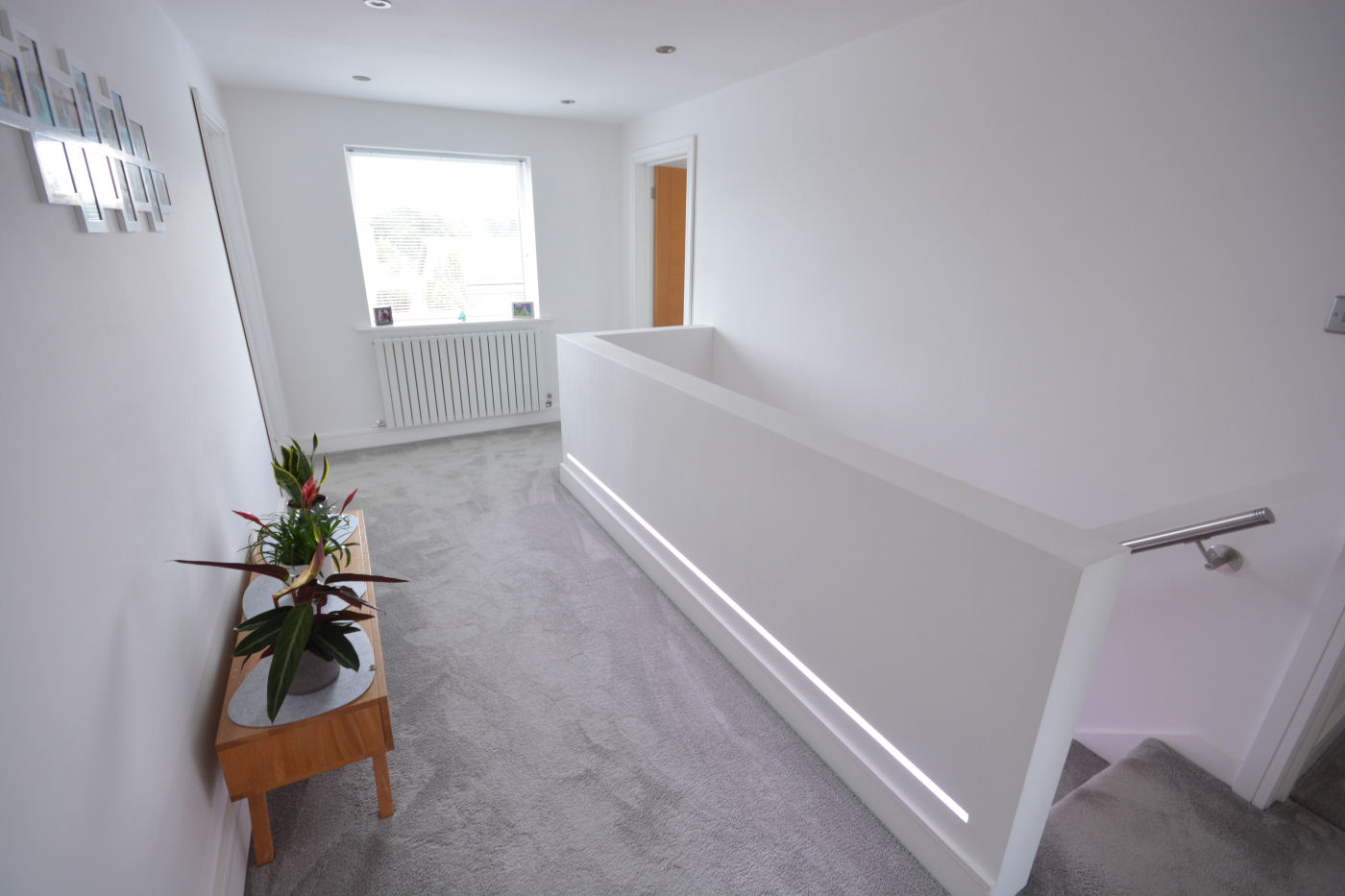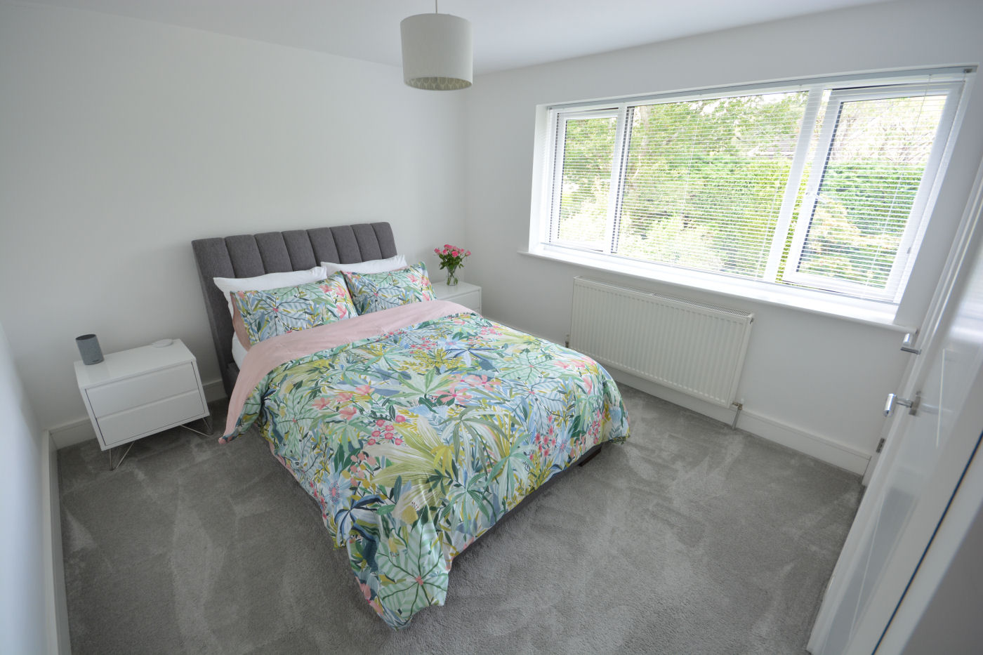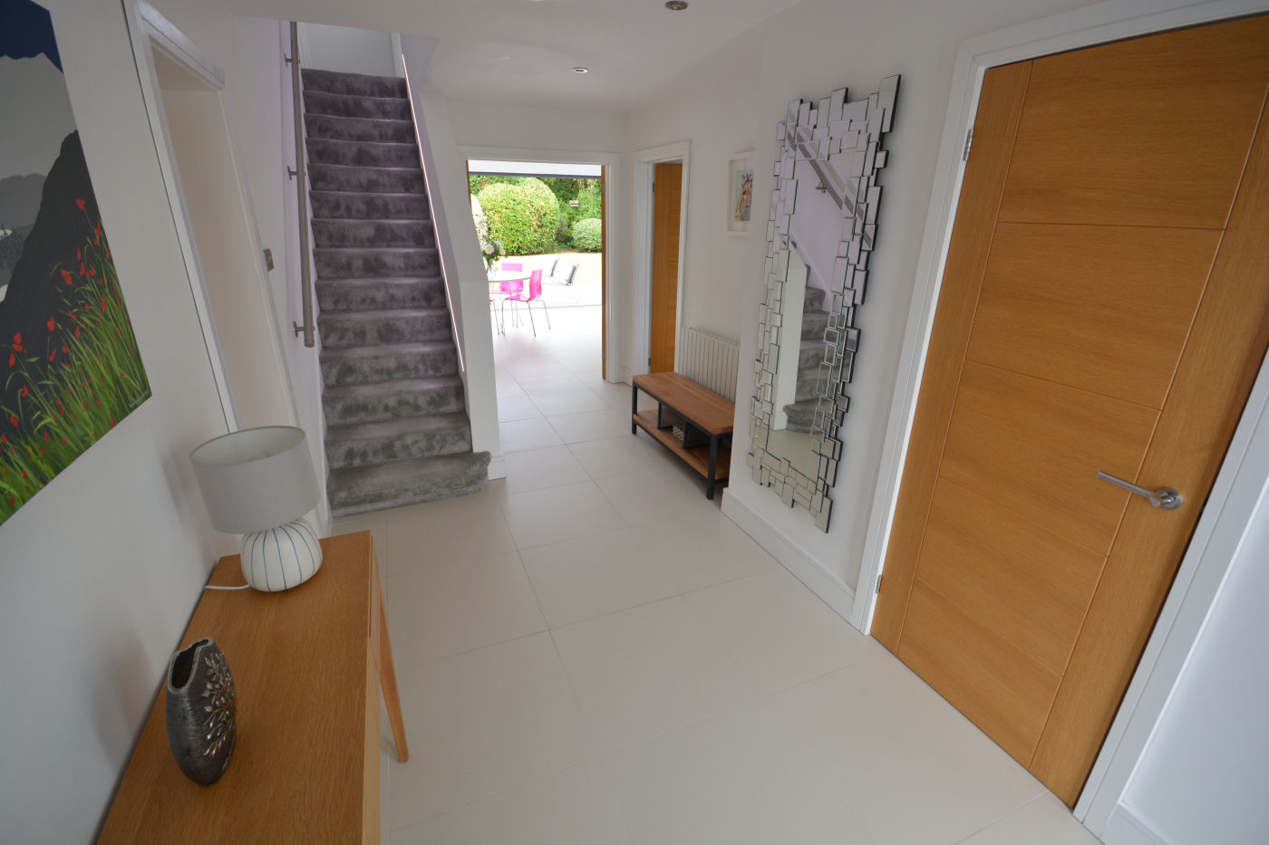 Ascending the stairs from the entrance hallway, the first-floor landing is well-lit with LED lighting and provides loft access. The master bedroom features a walk-in wardrobe with built-in furniture and an en suite shower room with a digital one-touch shower, offering ease and luxury. This room includes a wash hand basin with mixer tap set within a vanity unit, close-coupled WC, wall-mounted heated towel rail, and underfloor heating. The second bedroom, facing the front, also boasts a walk-in wardrobe and underfloor heating, along with an en suite shower room equipped with a similar digital one-touch shower and amenities. The third bedroom, overlooking the rear, has built-in cupboards, with one housing the central hub for the home’s technology, including the Cat 6 Ethernet, Sonos sound system, and home security system. The entire house is wired with Cat 6 network points in most rooms, providing fast, reliable internet connectivity throughout, ideal for home offices and streaming. The fourth bedroom offers ample space and flexibility. The family bathroom is well-appointed with a close-coupled WC, wash hand basin with mixer tap and vanity unit, panel-enclosed bath with dual showers, wall-mounted heated towel rail, part-tiled walls, and tiled flooring.