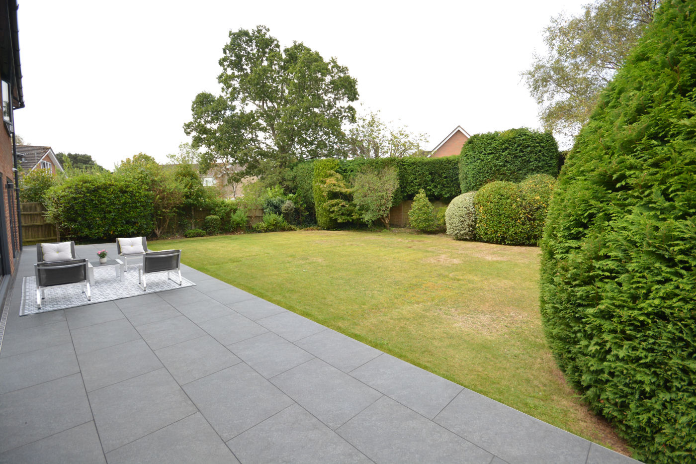 The property is surrounded by a well-maintained lawn, with a tarmac driveway leading to a double garage that includes power, lighting, built-in storage, and an electric door. The rear garden features a porcelain-tiled patio and established shrub borders. Exterior LED soffit lighting enhances the property’s nighttime appeal.
