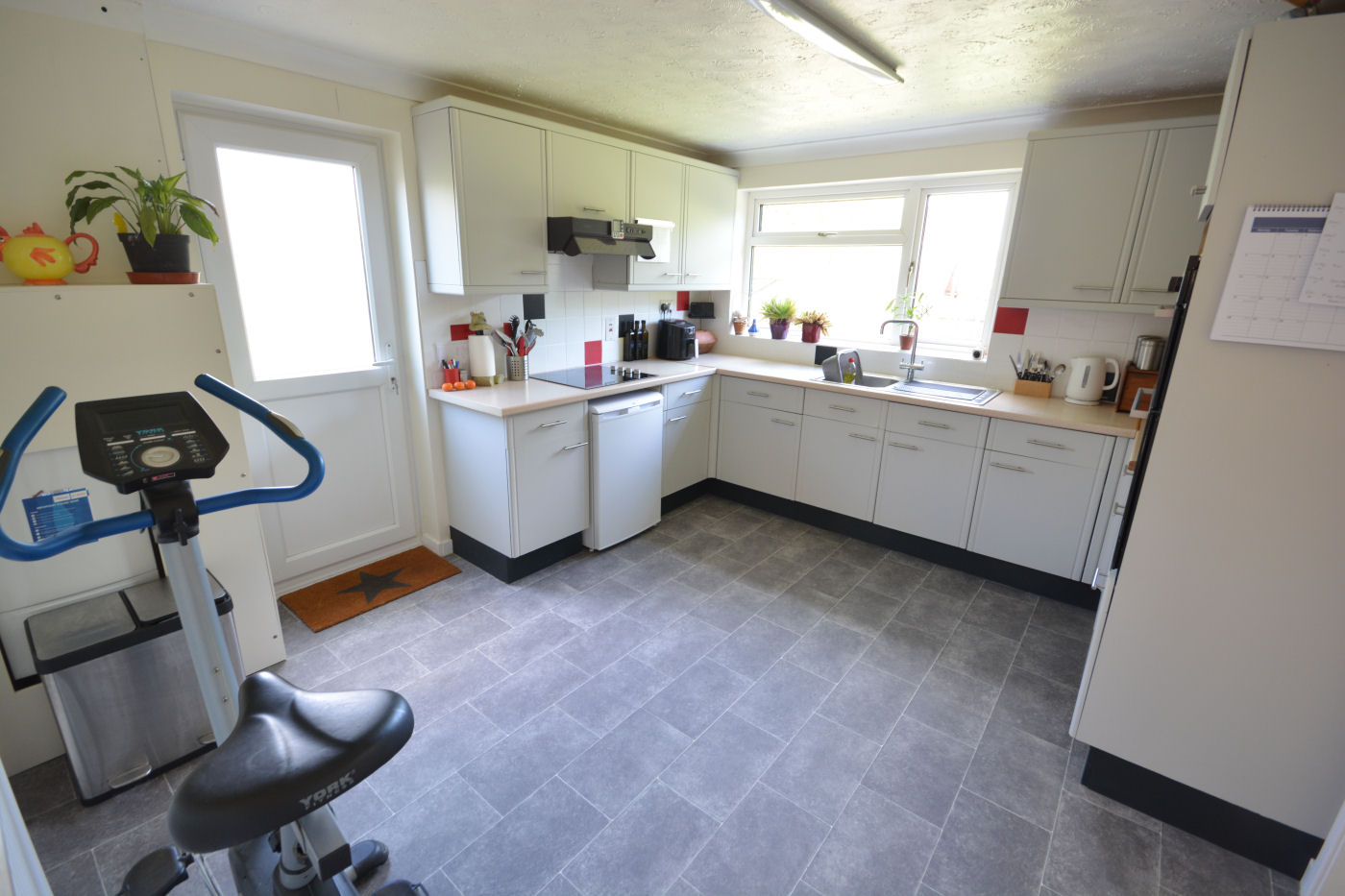 The front door gives access into the porch with window to side aspect and a frosted glazed door with matching side screen leads into the entrance hall which has window to side aspect, door into the double garage, stairs rising to first floor and access into the cloakroom which has frosted window to side, wood effect laminate flooring, wash hand basin with hot and cold tap with tiled splashback and low level flush WC. The light and airy lounge/dining room has window to front aspect, TV point, central brick built fireplace and sliding doors giving access to the garden room which in turn leads to the rear garden. The kitchen has window to rear aspect, frosted glazed door to side, ‘Worcester’ boiler, range of wall and floor mounted cupboards, roll top work surfaces, part tiled walls, single sink with drainer and mixer tap, larder cupboard, space for fridge and integrated appliances to include oven, grill, four ring ceramic hob and extractor fan over.