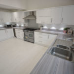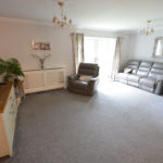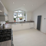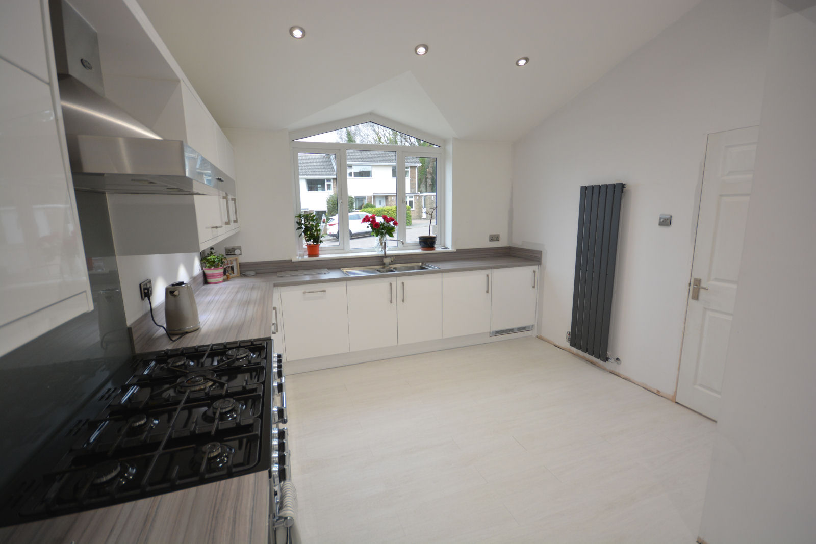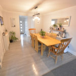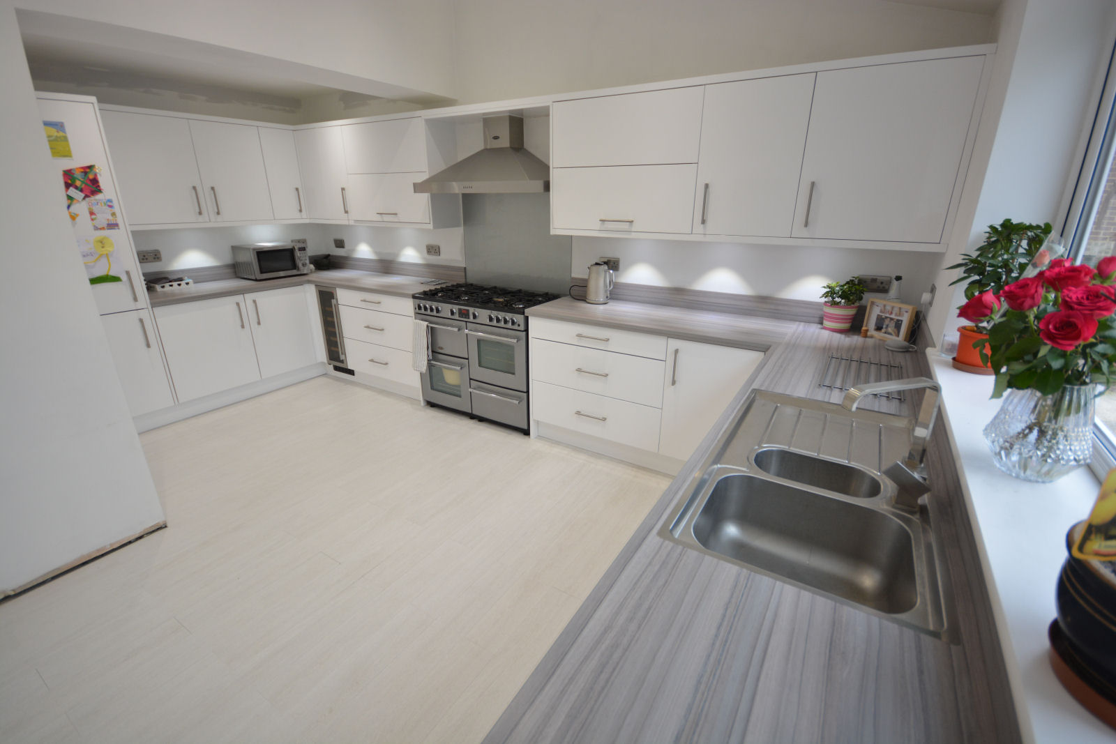 Composite double glazed frosted front door gives access to the entrance hallway which has a number of inset spotlights, storage cupboard and access into the ground floor cloakroom which has frosted window to front aspect, towel ladder radiator, vanity unit with inset wash hand basin and mixer tap with two drawers below and low level WC. The light and airy spacious lounge/dining room has sizeable storage cupboard, stairs rising to first floor, TV point, telephone point and double opening doors giving access to the rear garden. The impressive modern fitted kitchen has feature window to front aspect, range of wall and floor mounted cupboards, work surfaces, space for wine cooler, two nests of three pan drawers, one and a quarter single sink with drainer and mixer tap, space for Range cooker with ‘Belling’ extractor fan above and a number of integrated appliances to include tumble dryer, washing machine, dishwasher, freezer and fridge/freezer. Note, the flooring in the kitchen has been changed since the photo was taken.