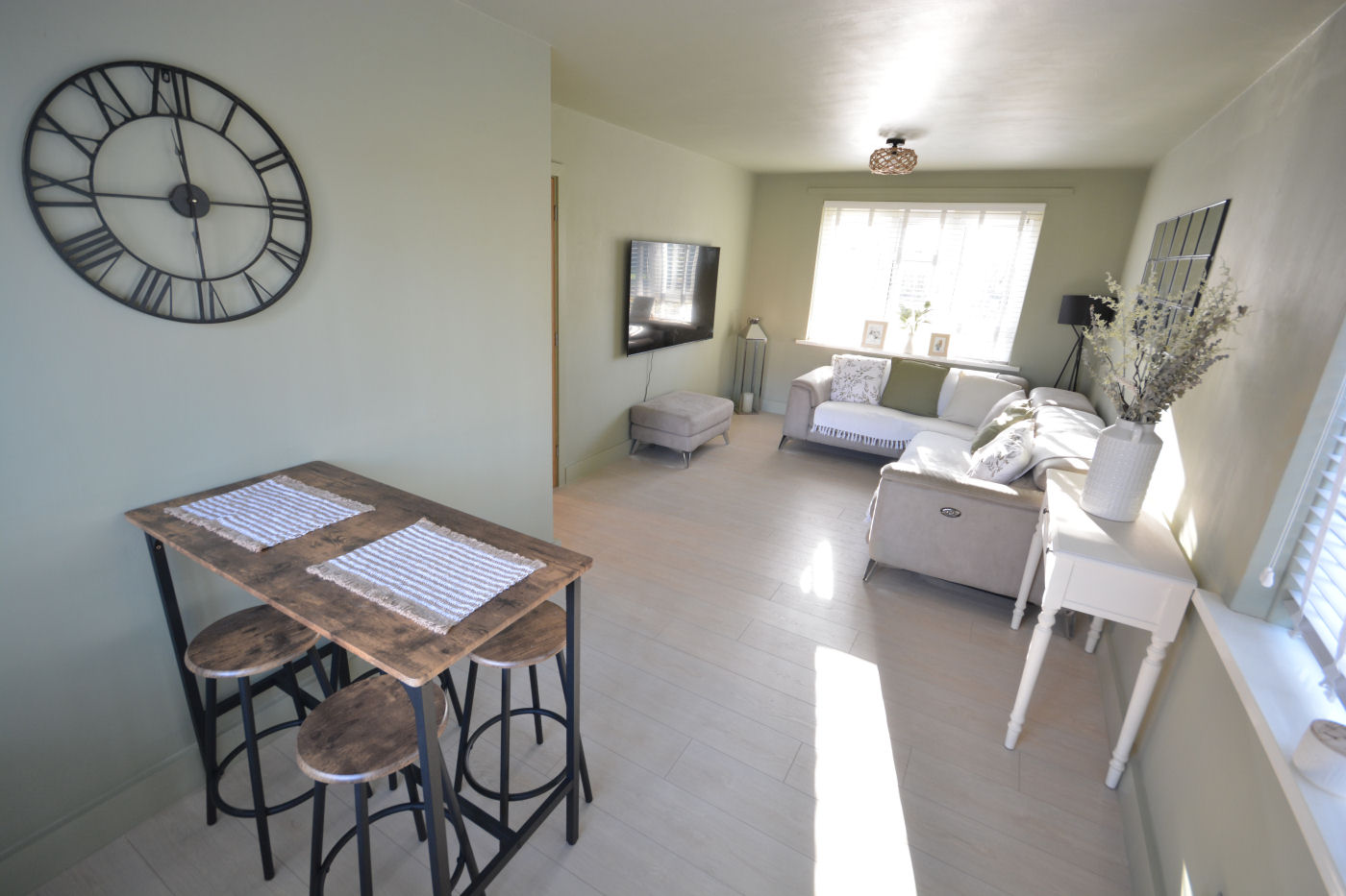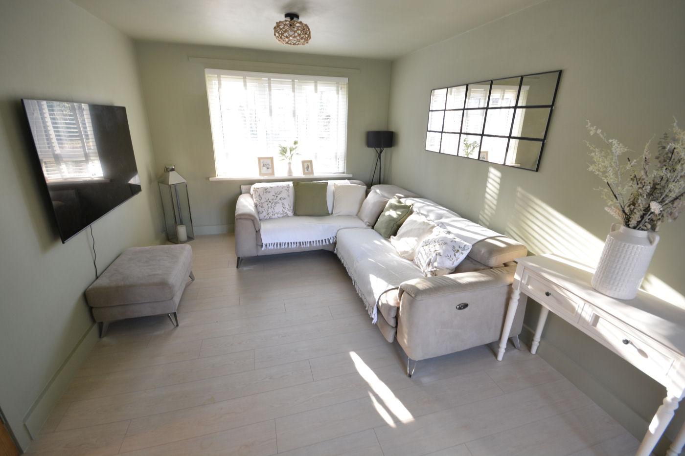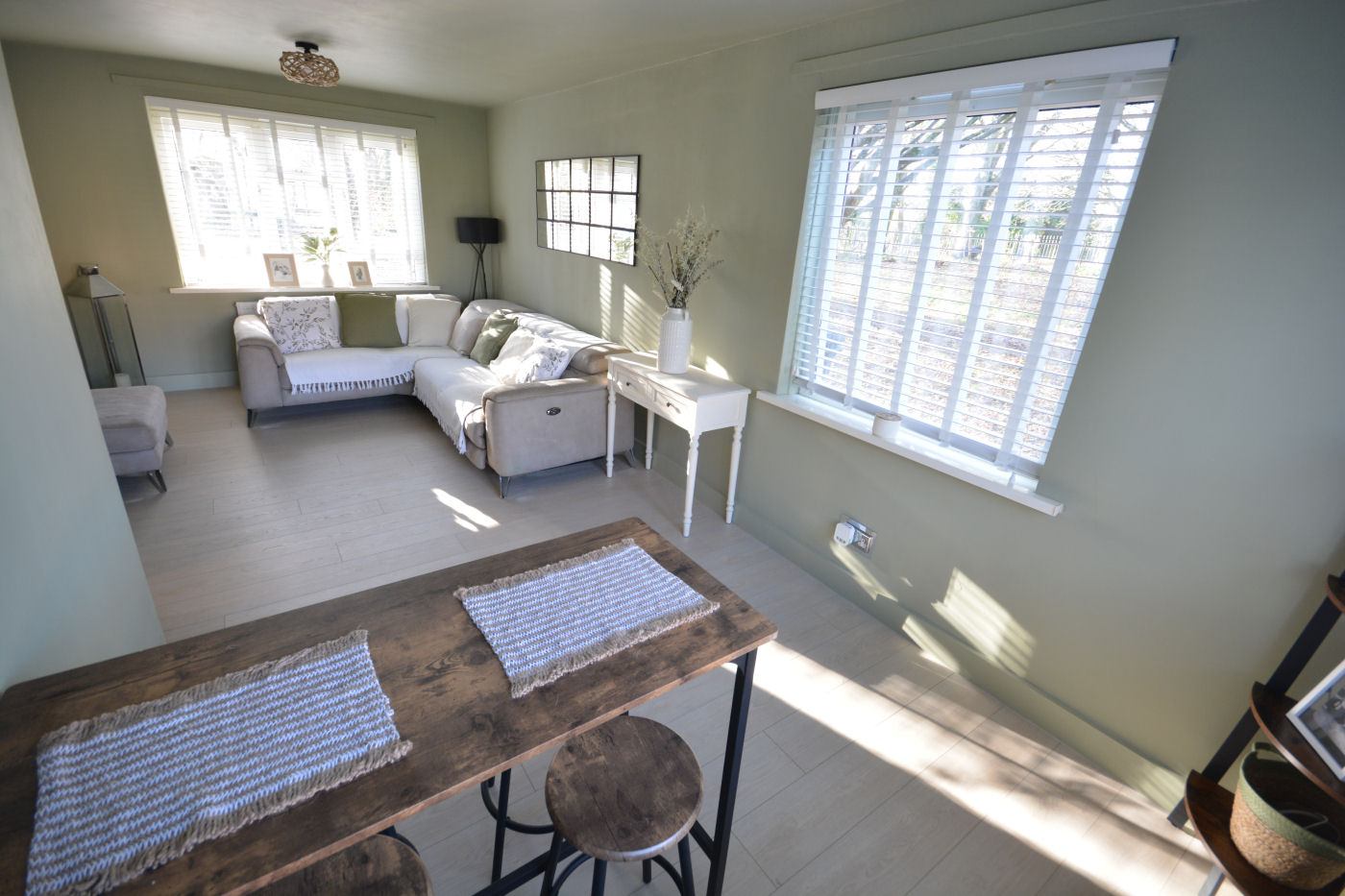 Via the front door with spy hole gives access to the entrance hallway which has door entry phone system, wood effect laminate flooring, telephone point, two useful storage cupboards and access into the store room which has automatic light, wood effect flooring and fuse box. The modern fitted kitchen has window to front aspect, range of wall and floor mounted cupboards, single sink with drainer and mixer tap, wood effect flooring, cupboard housing ‘Glow Worm’ boiler and space for tall fridge/freezer, washing machine and oven. The light and airy lounge/dining room has windows to front, side and rear aspect, wood effect flooring and TV point.